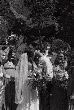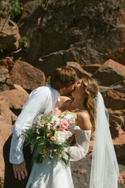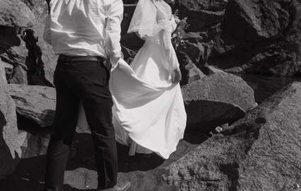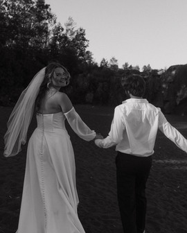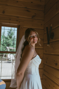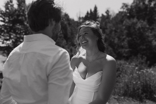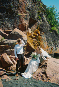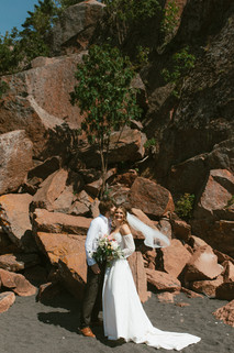 Annie and Matthew tied the knot on a scorching 90-degree summer day in northern Minnesota. When I entered the cabin where Annie was preparing, the atmosphere was lively. She and her friends were getting ready together, assisting Annie with her hair, and enjoying music. Once they were all set, they joined the rest of the party at the beach for Annie and Matthew's first look. The ceremony was held right on the shoreline of The Black Sand Beach surrounded by their loves ones, the beautiful cliffs, and flowers. Afterward, they headed to the tent for dinner and a coffee bar. Following the meal, they danced and cooled off by jumping into Lake Superior with all of their friends and family where they hung out on the beach until the sunset.